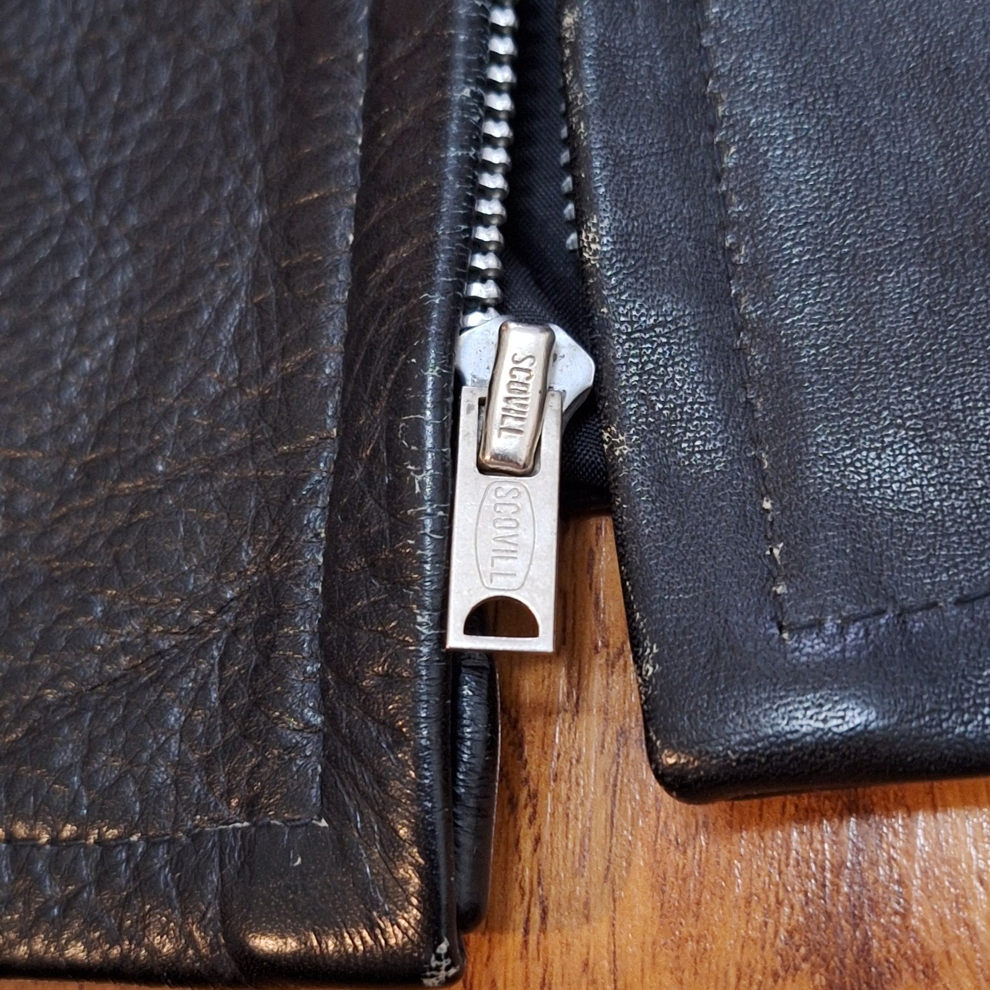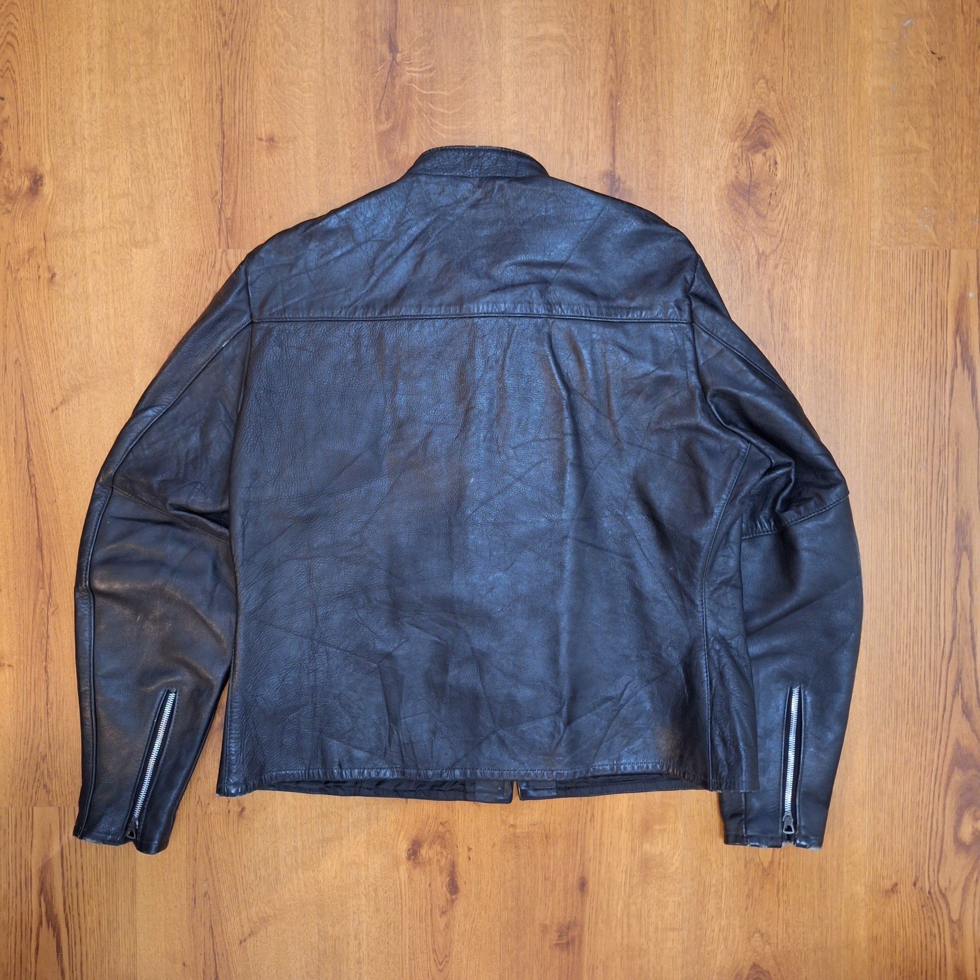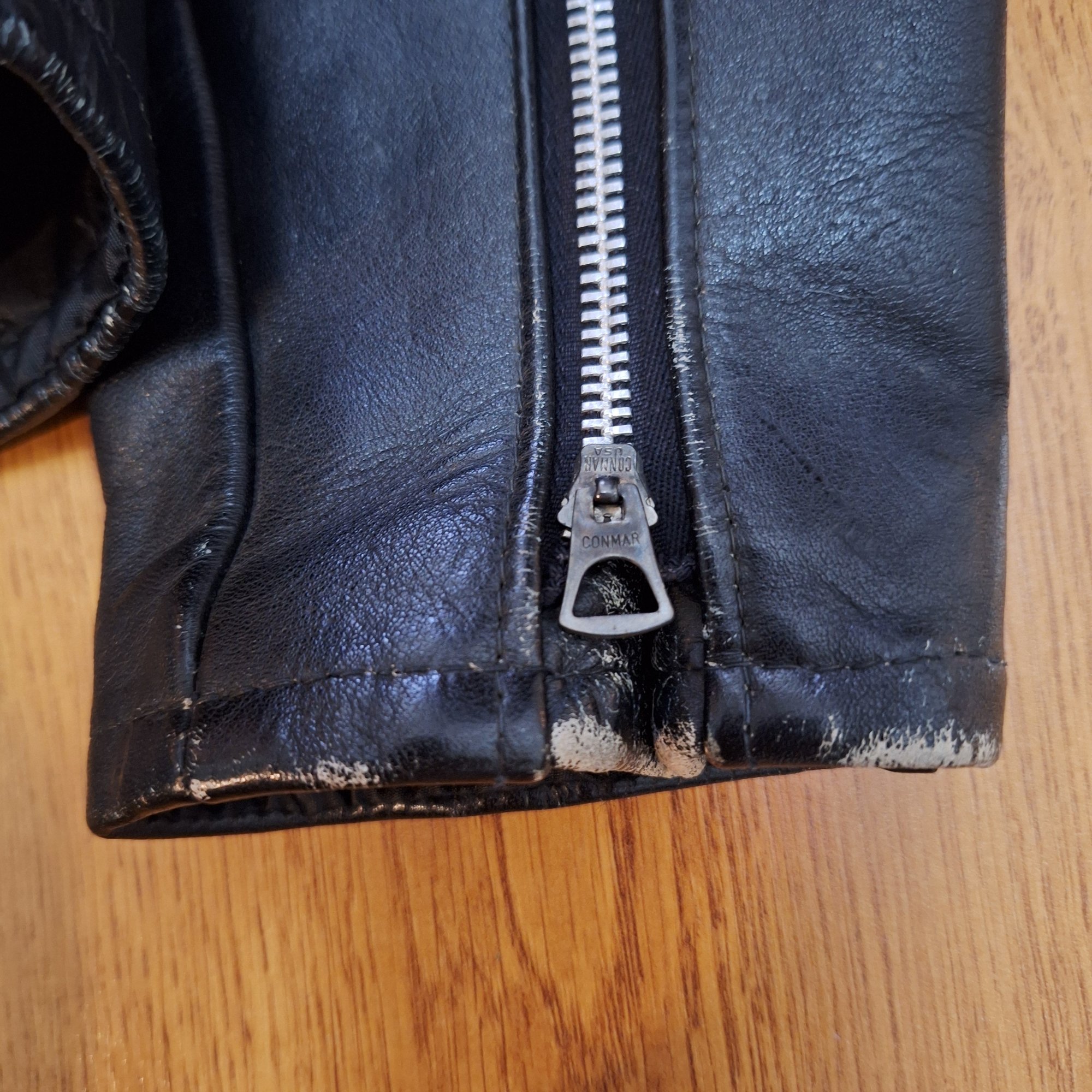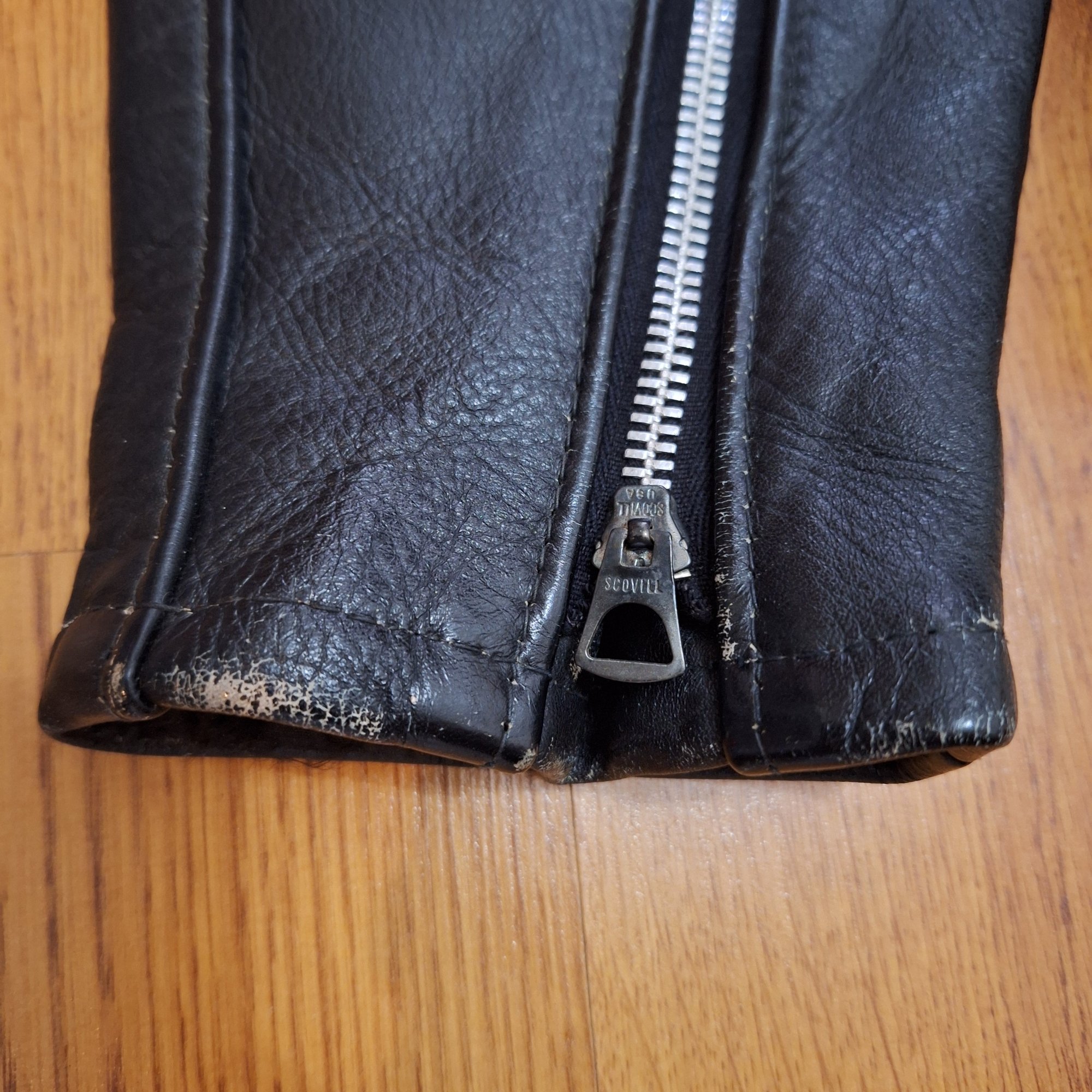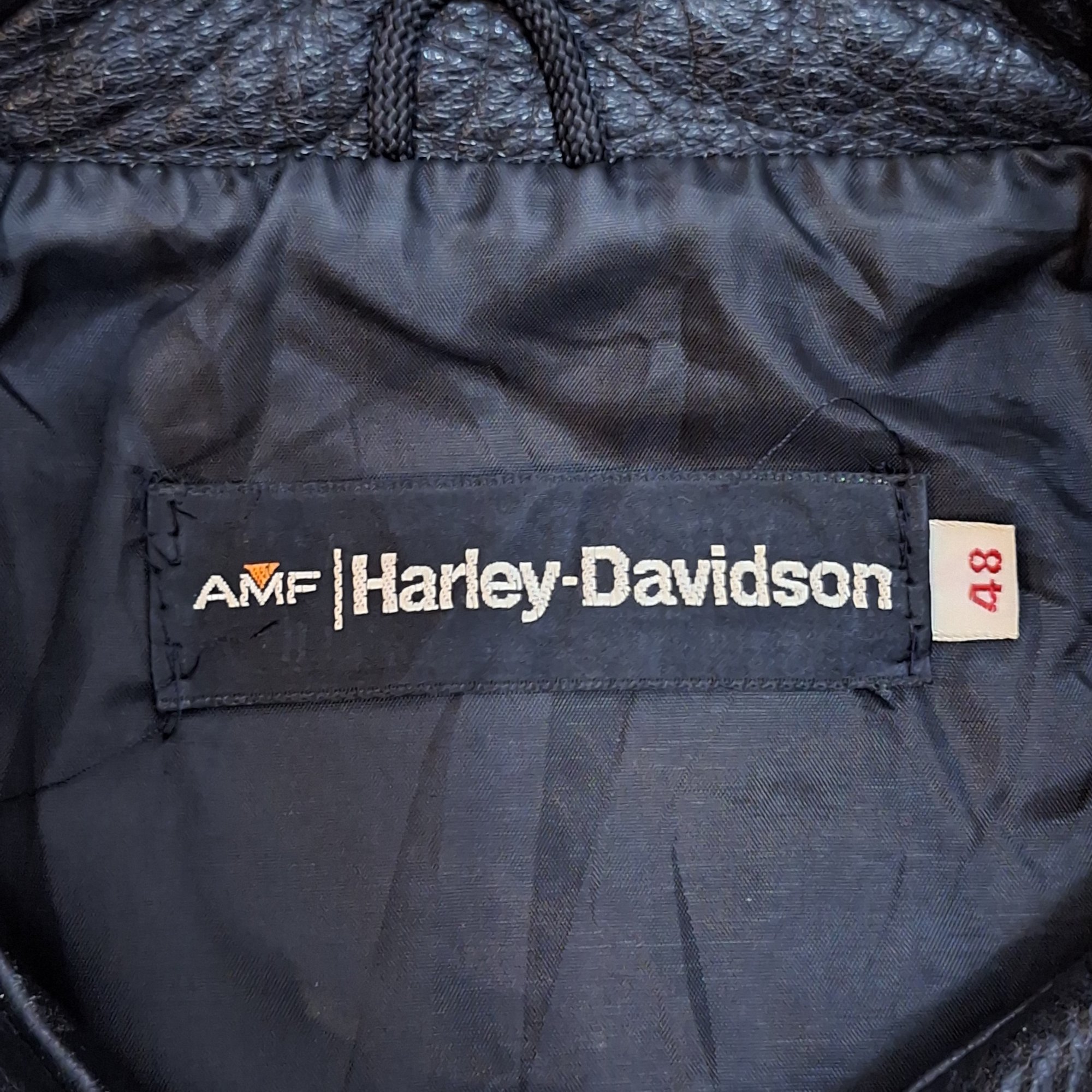🔮 Vintage black leather (likely horsehide) cafe jacket. Jacket retains original Harley Davidson label and size tag. Original main zipper is a Scovill, chest zip is a Conmar, and both sleeve zips are Scovill brand. All zippers work perfectly.